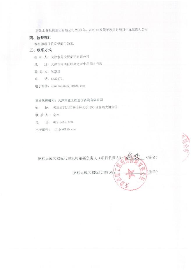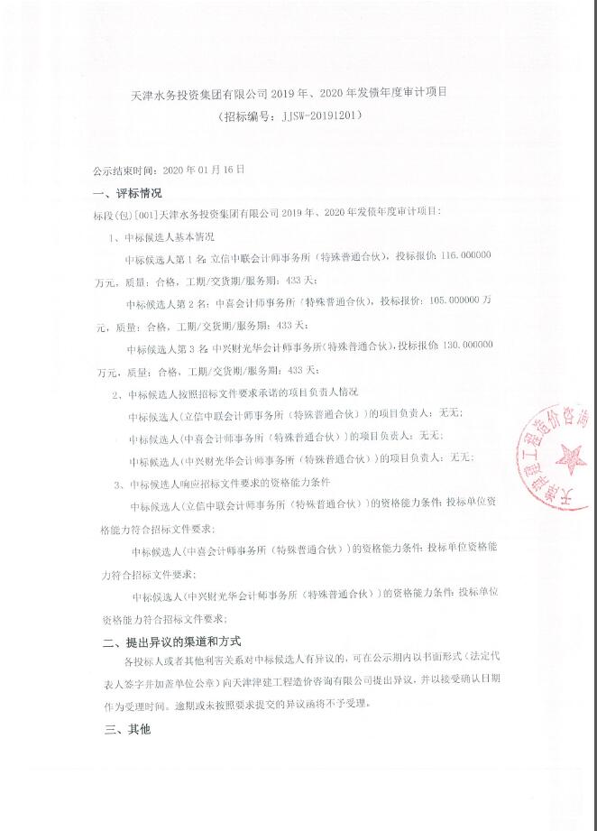 天津水務(wù)投資集團(tuán)有限公司2019年、2020年發(fā)債年度審計(jì)項(xiàng)目-中標(biāo)候選人公示