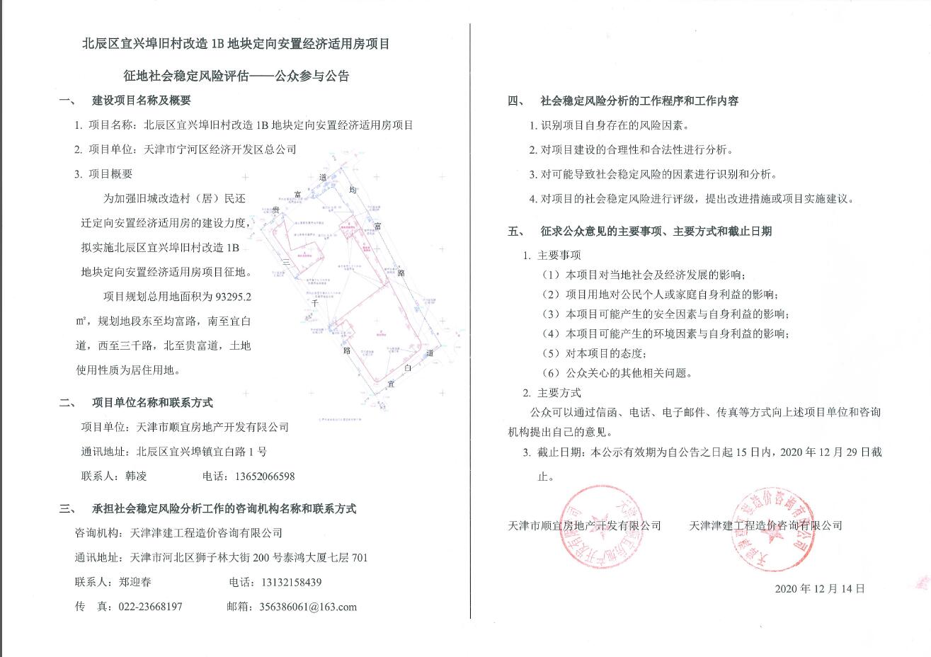北辰區(qū)宜興埠舊村改造1B地塊定向安置經(jīng)濟(jì)適用房項(xiàng)目征地社會穩(wěn)定風(fēng)險(xiǎn)評估-公眾參與公告