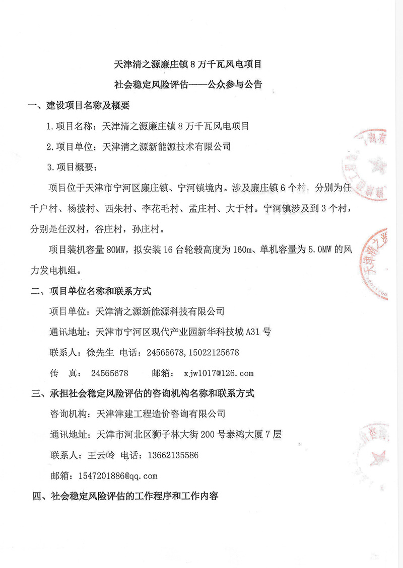 天津清之源廉莊鎮(zhèn)8萬千瓦風(fēng)電項目社會穩(wěn)定性風(fēng)險評估項目網(wǎng)絡(luò)公示2
